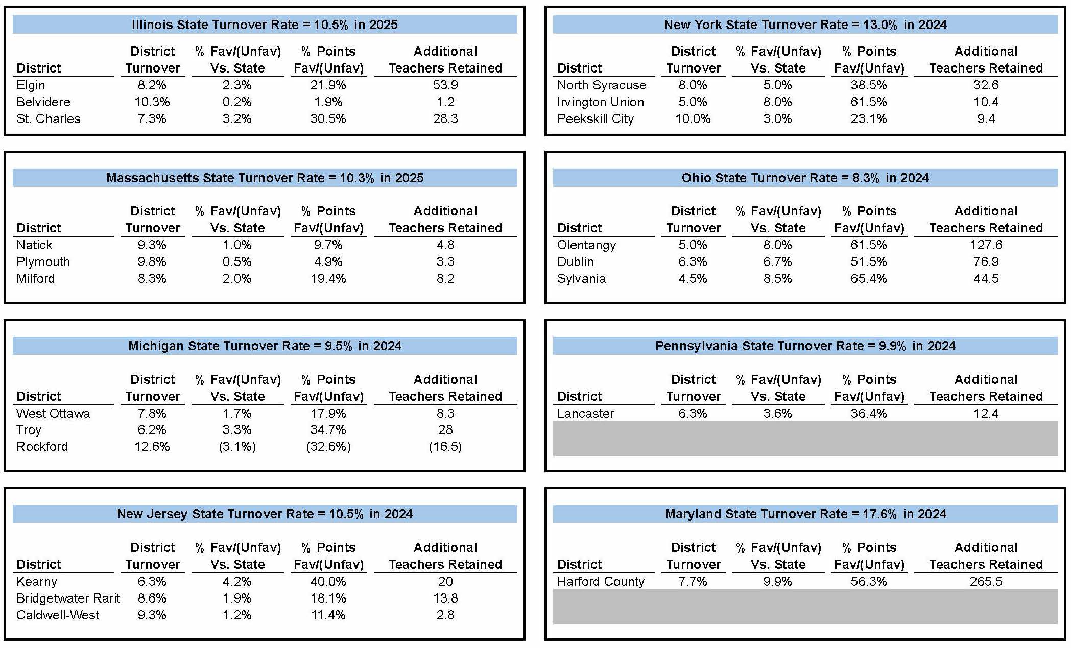 Summary Findings: 95% of public school districts investing in graduate-degree-eligible courses retained more teachers and were able to avoid on average more than $495,000 in replacement costs for teachers in 2024 compared to their state’s published turnover rate in 2024. 15 of the 21 districts had a turnover rate that was 15% points or more favorable vs. their respective state’s turnover rate.
