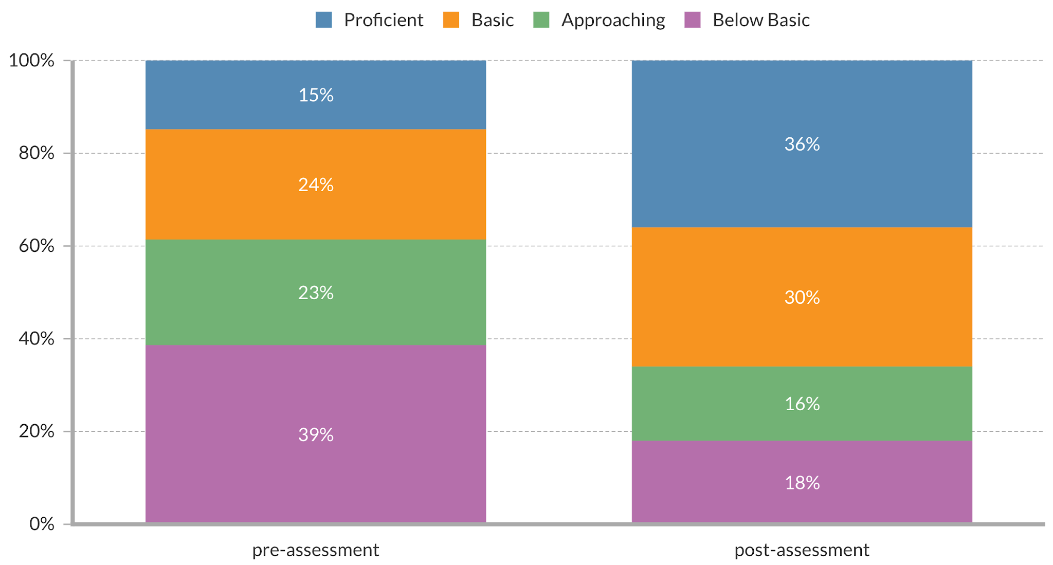 The percentage of students who tested ‘proficient’ in Math increased by 21 points, a 2x increase from the pre-assessments.